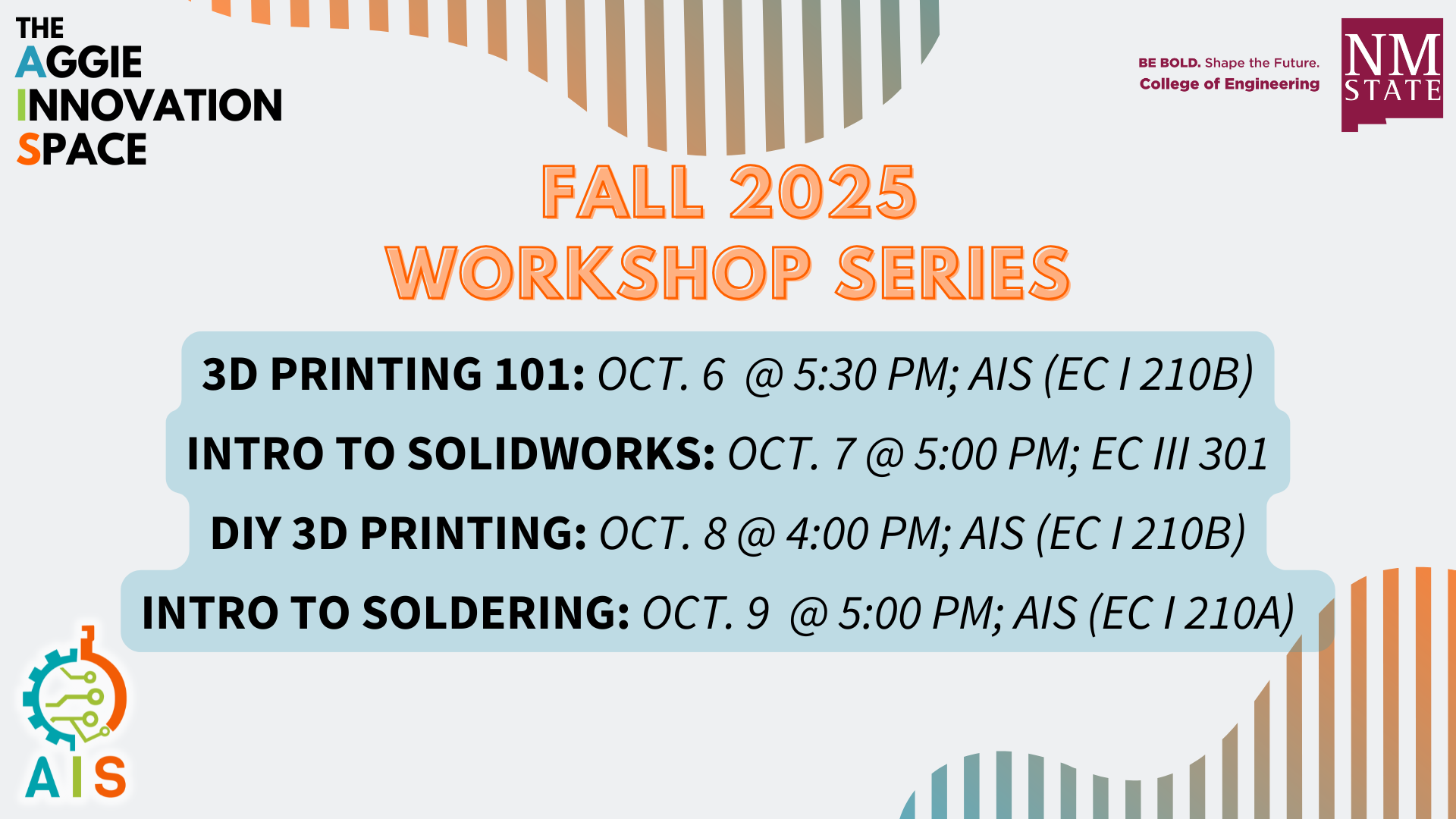 The Aggie Innovation Space hosts a workshop series every semester on a variety of topics. These workshops are open to everyone, including students, faculty, and community members. Attend one of our workshops and explore a new skill!